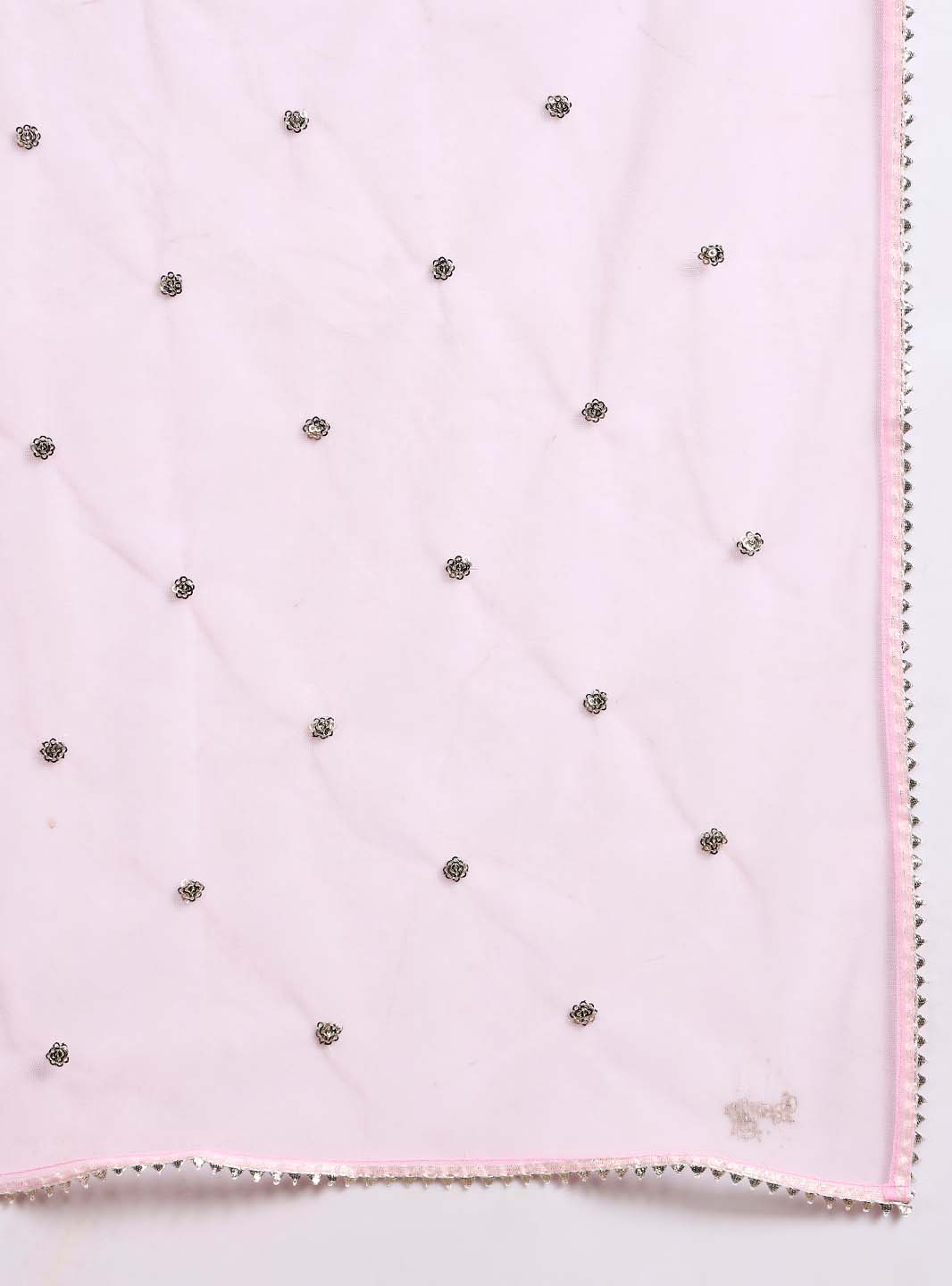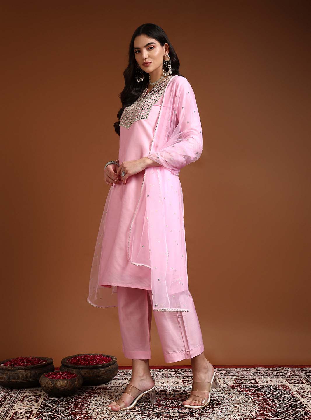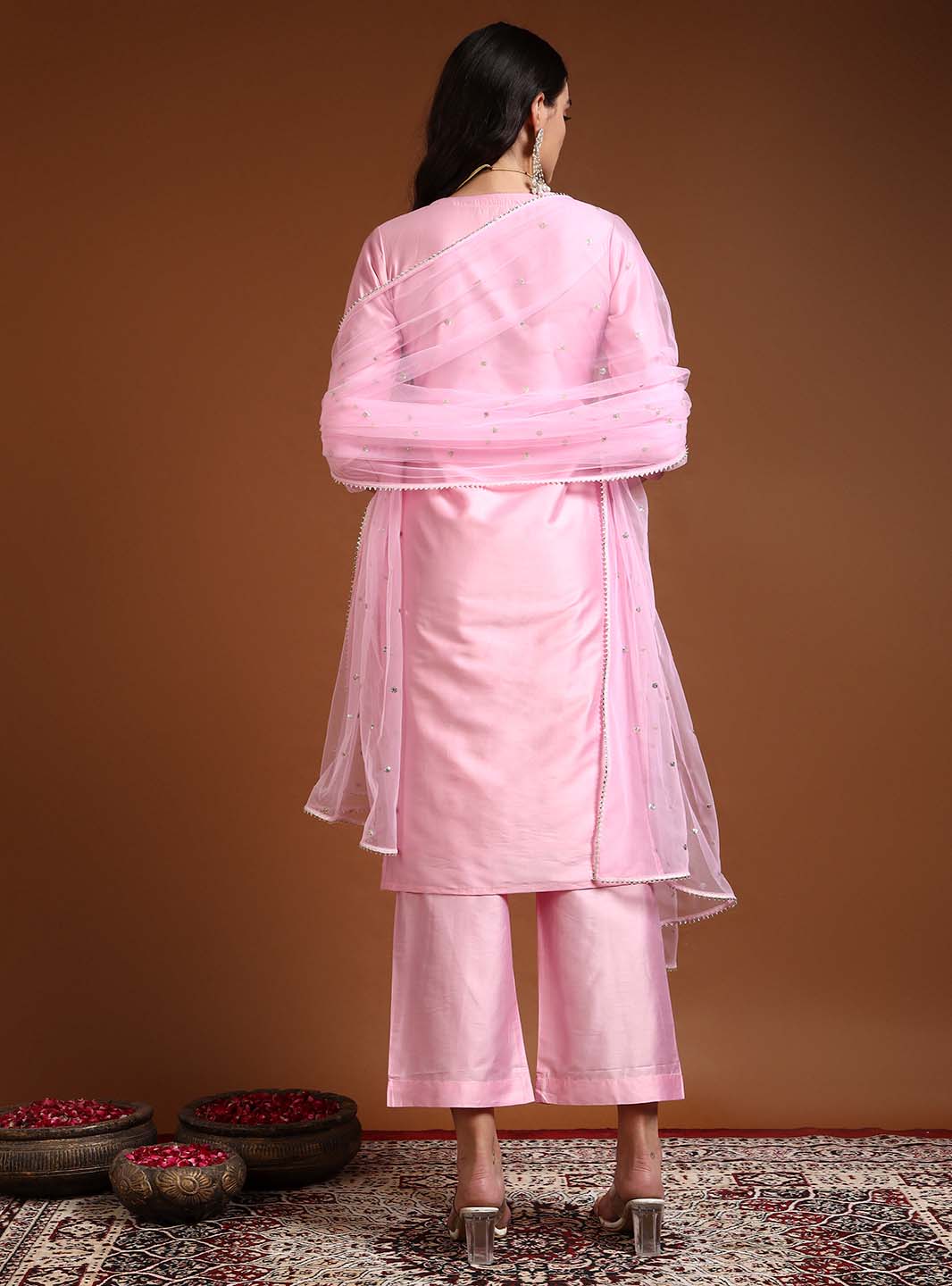 Pink Chanderi Straight Kurta Set with Mirror Work & Net Dupatta
