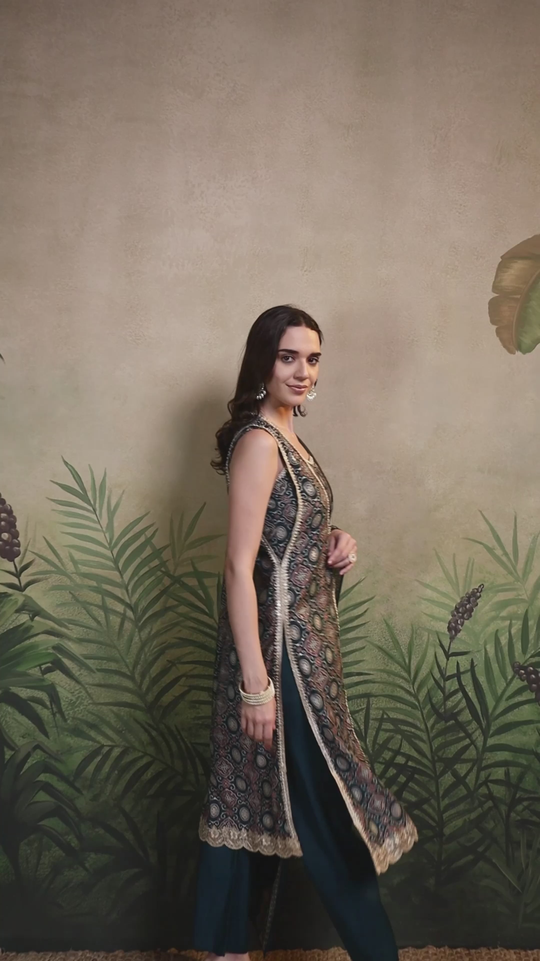 Green V-Neck Fusion Kurta Set with Blouse & Printed Dupatta